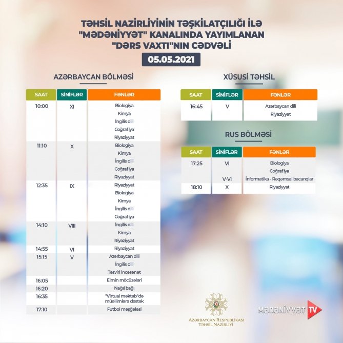“Mədəniyyət” və “ARB Günəş” telekanallarında yayımlanan “Dərs vaxtı” proqramının mayın 5-nə nəzərdə tutulan cədvəli açıqlanıb.