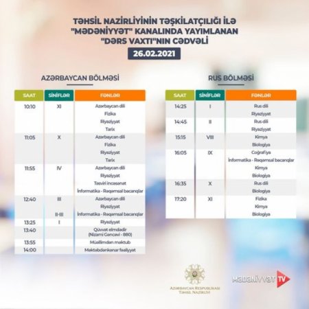 Qeyd edək ki, “Dərs vaxtı”na ekran qarşısında baxa bilməyənlər keçirilmiş dərsləri Təhsil Nazirliyinin rəsmi yutub kanalı ilə yanaşı, “Dərs vaxtı”nın feysbuk səhifəsindən, eyni zamanda, videodərslər portalından (https://video.edu.az/) izləyə bilərlər.