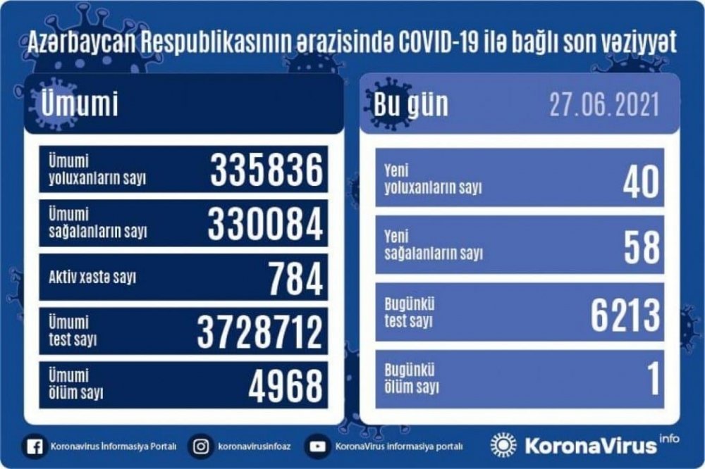 Azərbaycan Respublikasında koronavirus infeksiyasından daha 58 nəfər müalicə olunaraq sağalıb, 40 yeni yoluxma faktı qeydə alınıb.
