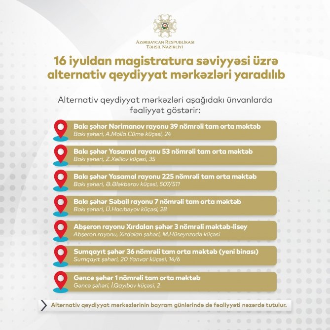 Ali təhsilin magistratura səviyyəsi üzrə təhsil müəssisələrinə elektron qeydiyyat prosesinə dəstək olmaq üçün iyulun 16-dan alternativ qeydiyyat mərkəzləri fəaliyyətə başlayıb.