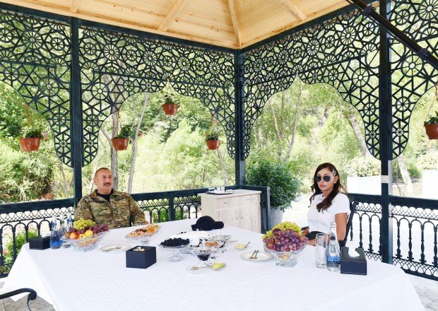 Dövlət başçısı və birinci xanım Kəlbəcərdə çay kənarında əyləşiblər. Onlar süfrə arxasında birgə çay içiblər.