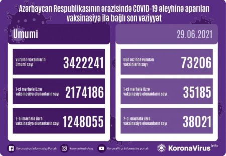 Azərbaycanda bu günə qədər vurulan vaksinlərin ümumi sayı 8 milyon 43 min 423, birinci mərhələ üzrə peyvənd olunanların ümumi sayı 4 milyon 636 min 579, ikinci mərhələ üzrə vaksinasiya edilənlərin sayı 3 milyon 406 min 844 nəfər təşkil edir.Turaztv.az
