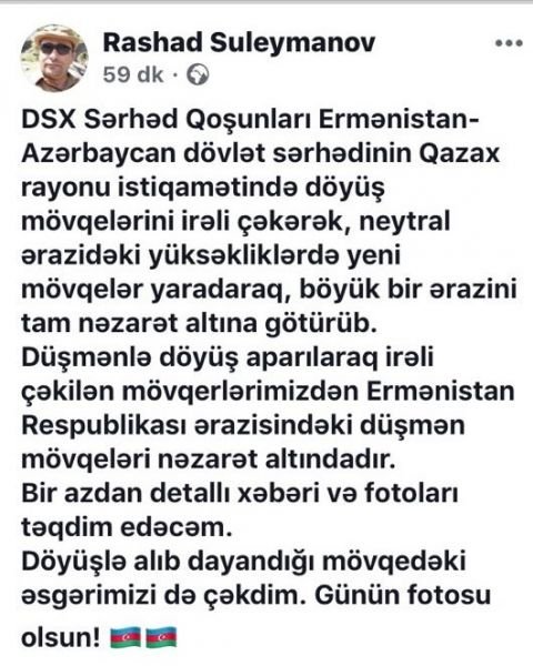 "AzeriDefence” jurnalının baş redaktoru, hərbi jurnalist Rəşad Süleymanov Azərbaycanın sərhədçilərinin Qazax istiqamətində döyüş mövqelərini irəli çəkdiyini bildirib.
