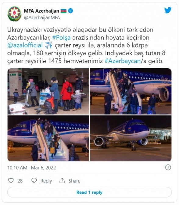 Ukraynadakı vəziyyətlə əlaqədar bu ölkəni tərk edən azərbaycanlılardan daha 180 nəfəri Polşa ərazisindən həyata keçirilən çarter reysi ilə ölkəmizə gətirilib.