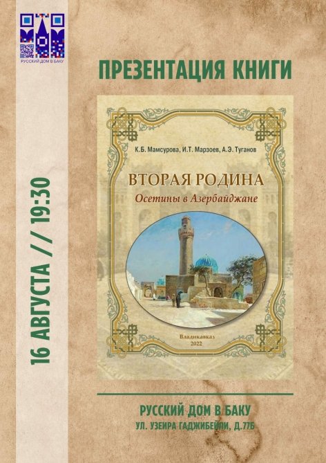 Avqustun 16-da saat 19:30-da Bakıdakı Rus evində (RİMM) "İkinci Vətən. Osetinlər Azərbaycanda" kitabının təqdimatı keçiriləcək.