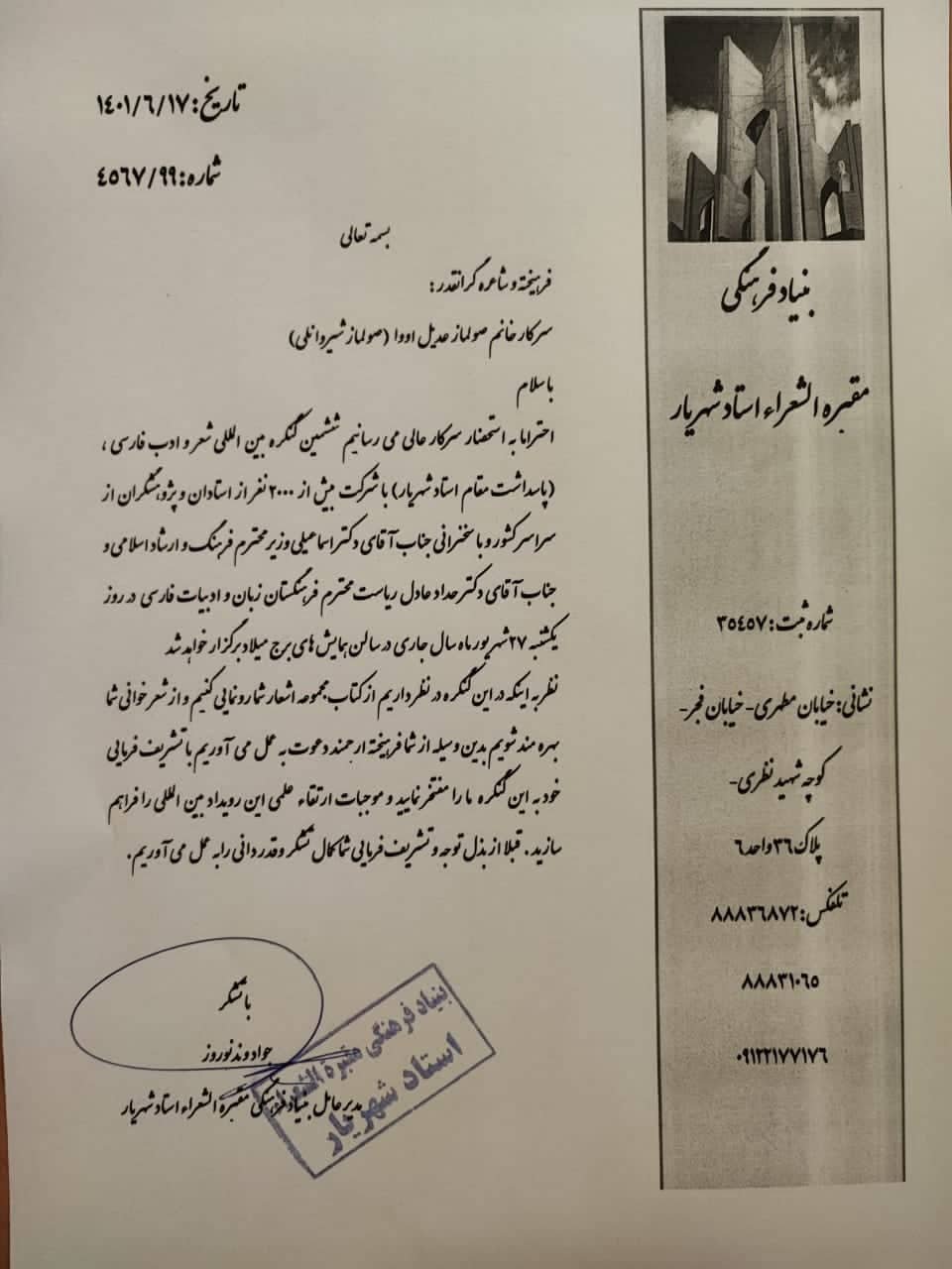 HÖRMƏTLƏ: SOLMAZ ŞİRVANLI {AYNAZ CƏVAHİR KƏLAM} 8-9-2022 N.4567/99 ALLAHIN ADI İLƏ Dəyərli şairə Solmaz xanım Ədiova(Solmaz Şirvanlı ) Salam Bilginizə çatdırırıq ki, ustad Şəhriyarı əzizləmə münasibətilə əlaqədar altıncı beynəlxalq Fars şeir və ədəb konqresi ,hörmətli mədəniyyət və islami irşad naziri cənab Dr.Ismaili,və Fars dili və ədəbiyyatı akademiyasının hörmətli sədri cənab Dr.Həddad- Adil ,və eləcə ölkənin hər yerindən gələn 2000 - dən çox alim və tədqiqtçının iştirakı ilə18 sentyabr tarixində Tehranın Milad qülləsinin konfrans zalında keçiriləcəkdir. Həmin konfransda şeir qiraət etməyə dəvət edildiyinizi və şeir toplusu kitabınızın təqdimatının keçiriləcəyini nəzərə alaraq, xahiş edərdik ki,konfransda iştirakınızla bizi qürurlandırıb, bu beynəlxalq tədbirin elmi cəhətcə keyfiyyətinin yüksəlişinə yardım edəsiniz. Diqqətiniz və təşrifiniz üçün öncədən olduqca təşəkkür edirik. İmza: Cavad Vəndi Noruzi Ustad Şəhriyar, Məqbərətüş-şüəra Mədəni fondunun icraçı direktoru.