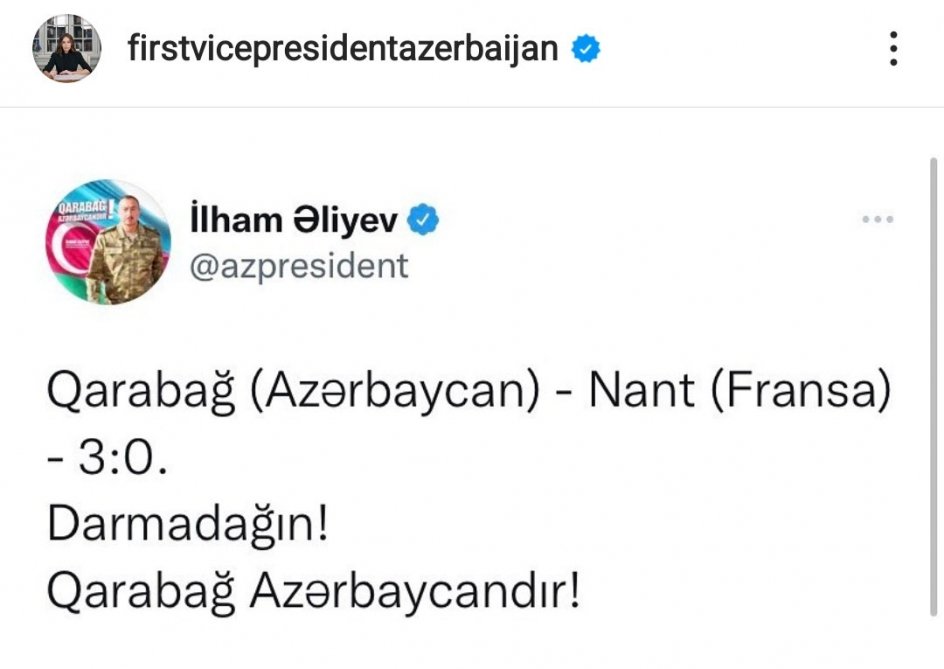 Azərbaycan Prezidenti İlham Əliyev “Qarabağ” klubunun Fransanın “Nant” komandası üzərində inamlı qələbəsi ilə bağlı paylaşım edib