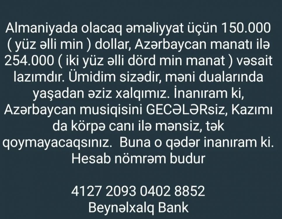 "Almaniyada olacaq əməliyyat üçün 150.000 dollar (254 min manat) vəsait lazımdır. Ümidim sizədir, məni dualarında yaşadan əziz xalqımız. İnanıram ki, Azərbaycan musiqisini "Gecələr"siz, Kazımı da körpə canı ilə mənsiz, tək qoymayacaqsınız. Buna o qədər inanıram ki...".