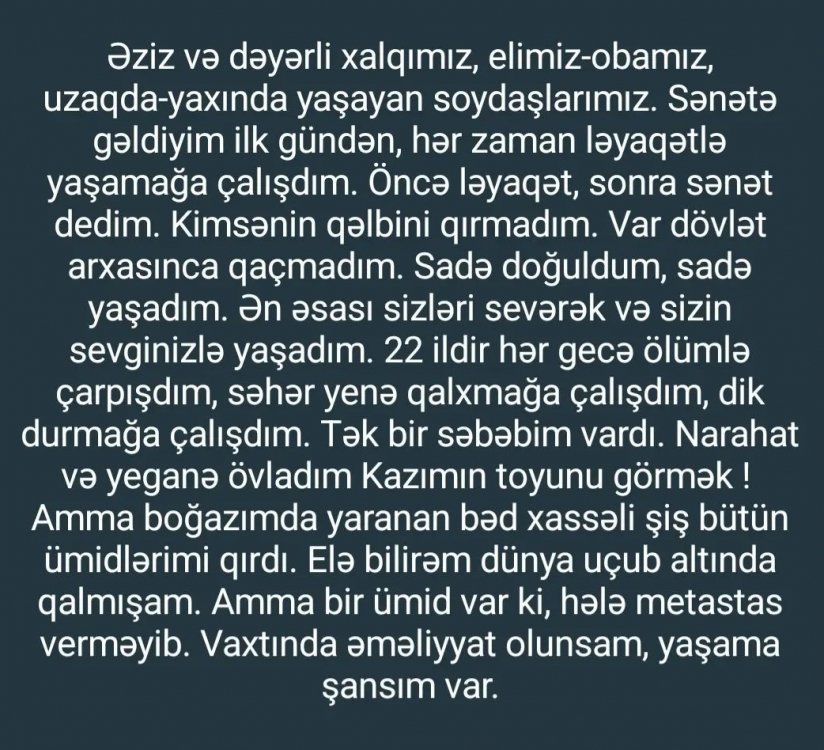 "Əziz və dəyərli xalqımız, elimiz-obamız, uzaqda, yaxında yaşayan soydaşlarımız. Sənətə gəldiyim ilk gündən, hər zaman ləyaqətlə yaşamağa çalışdım. Öncə ləyaqət, sonra sənət dedim. Kimsənin qəlbini qırmadım. Var-dövlət arxasınca qaçmadım. Sadə doğuldum, sadə yaşadım. Ən əsası sizi sevərək, sevginizlə yaşadım. 22 ildir hər gecə ölümlə çarpışdım, səhər yenə qalxmağa, dik durmağa çalışdım. Tək bir səbəbim vardı. Narahat və yeganə övladım Kazımın toyunu görmək! Amma boğazımda yaranan bəd xassəli şiş bütün ümidlərimi qırdı. Elə bilirəm dünya uçub altında qalmışam. Amma bir ümid var ki, hələ metastaz verməyib. Vaxtında əməliyyat olunsam, yaşama şansım var".