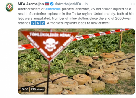 Ermənistan tərəfi üçtərəfli Bəyanatı kobud şəkildə pozaraq hərbi təxribatlarını davam etdirib və 2022-ci ilin avqust ayından etibarən Azərbaycanda 2021-ci il Ermənistan istehsalı 2700-dən çox mina aşkar olunub. Mülki ərazilərin minalarla hədəfə alınması nəinki günahsız mülki şəxslərin həyatına təhdid yaradır, Azərbaycanın hələ də əldə olunmasına sadiq qaldığı sülh sazişini təhlükə altında qoyan bir təxribatdır. Cəmi üç həftə əvvəl Kəlbəcər rayonunda minanın partlaması nəticəsində 7 azərbaycanlı, o cümlədən bərpa işlərində iştirak edən 4 mülki şəxs yaralanıb, bir azərbaycanlı isə həlak olub.