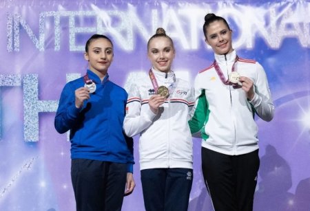 AZƏRTAC Azərbaycan Gimnastika Federasiyasına istinadla xəbər verir ki, beş halqa, üç lent və iki topla hərəkətlərin icrasında finalda mübarizə aparan təmsilçilərimiz ümumilikdə 61 xal toplayaraq fəxri kürsünün üçüncü pilləsində yer alıblar.