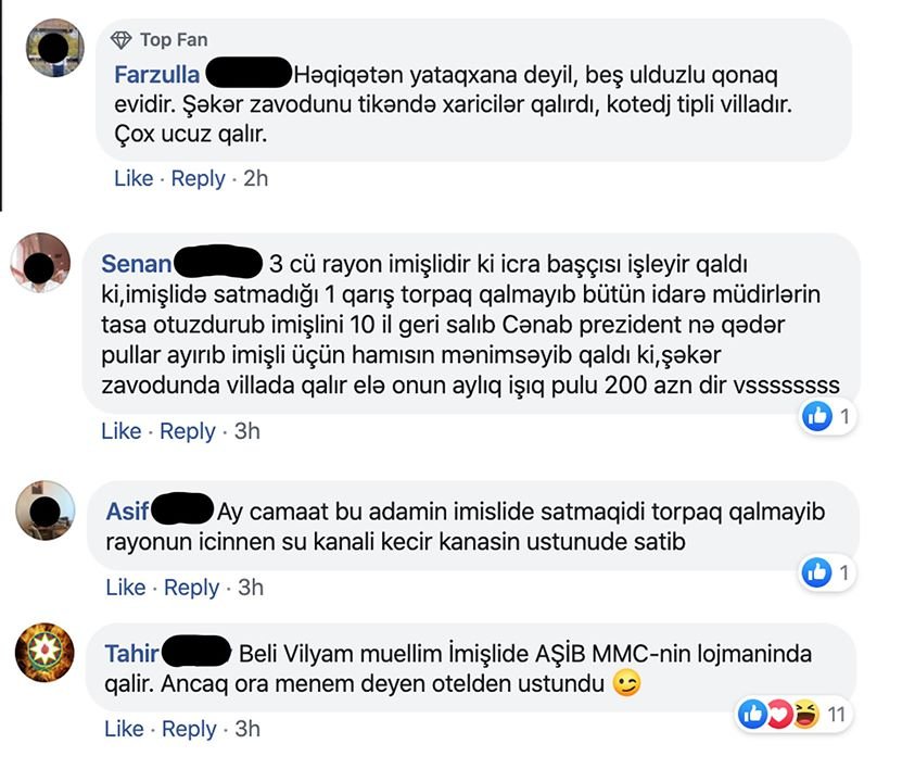 Dekabrın 20-si İmişlinin icrabaşı olan Vilyam Hacıyev haqqında statusumdan sonra saytlar rəsmi mövqe öyrəniblər. Belə ki, güya o, İmişlidə şəkər zavodunda ailələr üçün tikilmiş yataqxanada, ailəsi ilə birlikdə aylıq 124 manat kirayə haqqı ödəməklə yaşayır. Və deyib ki, mən sadaladıqlarımı faktlarla göstərməsəm, hüquq-mühafizə orqanlarına və məhkəməyə kəskin şikayətini bildirəcək.
