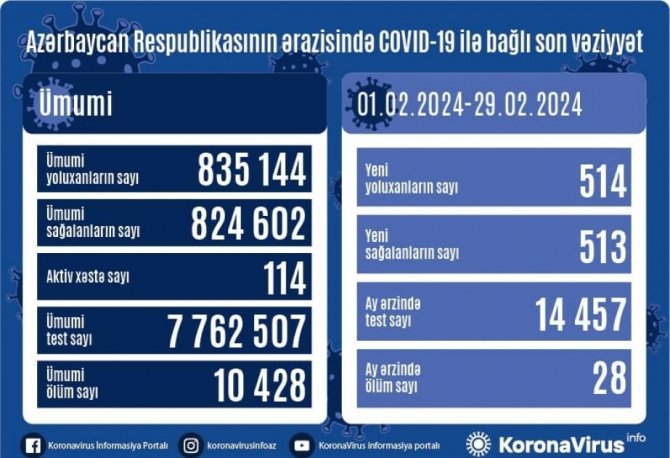 Son bir ayda (1 fevral-29 fevral) Azərbaycanda yeni növ koronavirus (COVID-19) infeksiyasına 514 yoluxma faktı qeydə alınıb, 513 nəfər müalicə olunaraq sağalıb, analiz nəticələri müsbət çıxan 28 nəfər həyatını itirib.