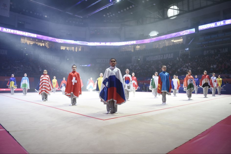 Turaztv.az “Qafqazinfo”-ya istinadən xəbər verir ki, Milli Gimnastika Arenasında təşkil edilən tədbirdə əvvəlcə iştirakçı ölkələrin Dövlət bayraqları arenanın mərkəzinə gətirilib.