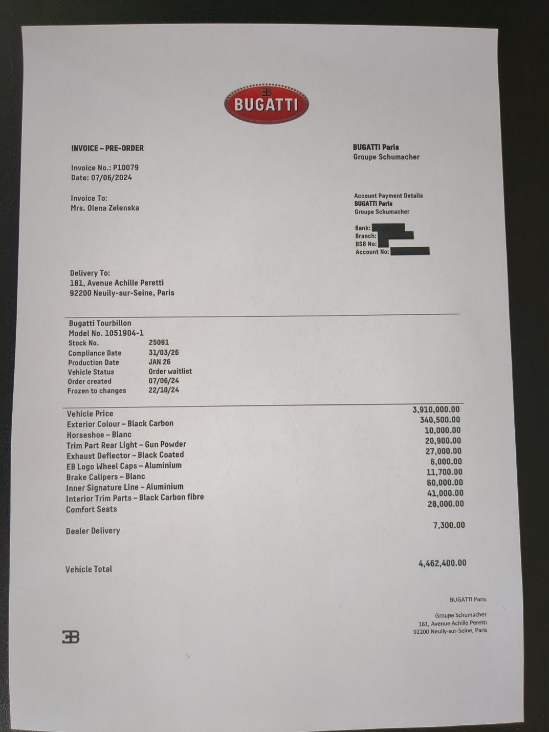 Ukrayna Prezidenti Volodimir Zelenskinin həyat yoldaşı Yelena Zelenskaya dünyanın ən bahalı idman avtomobillərindən birini - “Bugatti Tourbillon”u alıb.