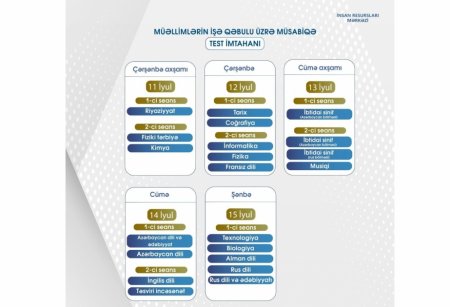 İyulun 2-10-da baş tutan ölkənin 18 müxtəlif şəhər və rayonu üzrə ümumilikdə 39 imtahan mərkəzini əhatə edən müəllimlərin işə qəbulu üzrə müsabiqənin test imtahanları mərhələsi başa çatıb.