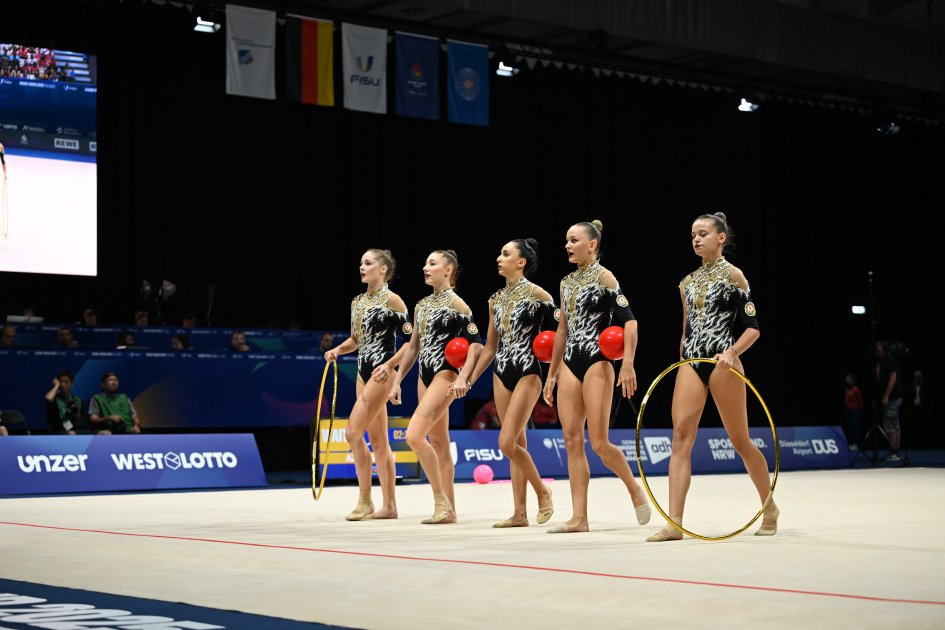 Turaztv.az AZƏRTAC-a istinadən xəbər verir ki, Ləman Əlimuradova, Kamilla Əliyeva, Yelizaveta Luzan, Darya Sorokina və Güllü Ağalarzadədən ibarət bədii gimnastika üzrə qrup komandası bu dəfə 3 top və 2 halqa ilə hərəkətlərdə fərqlənib.