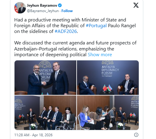 Azərbaycan xarici işlər naziri Ceyhun Bayramov Antalya Diplomatiya Forumu çərçivəsində Portuqaliyanın dövlət və xarici işlər naziri Paulo Rangel ilə görüşüb.